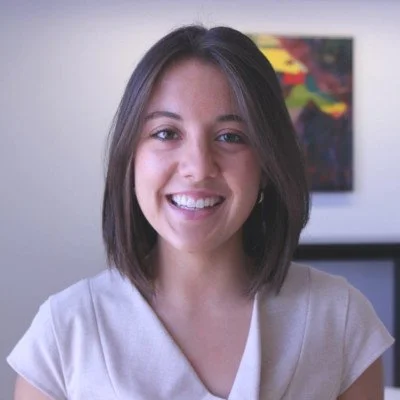 A woman with shoulder-length dark brown hair smiling at the camera, wearing a light-colored top, with abstract colorful artwork on the wall in the background.