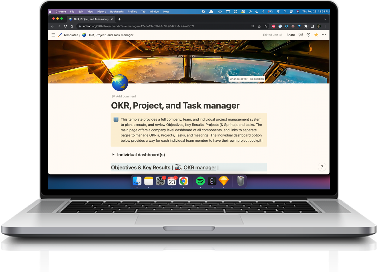 Laptop screen displaying a webpage titled 'OKR, Project, and Task manager' with an aerial view of Earth's atmosphere from space as the header image and various app icons on the dock below.