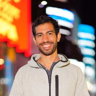 Smiling man with dark hair and beard wearing a light gray hoodie, standing outdoors at night with colorful neon signs in the background.